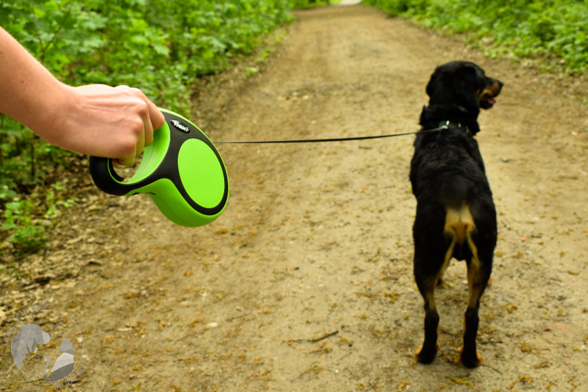 Generalnie Flexi zawsze budziła moje obawy przed użyciem: czy sobie z nią poradzę i czy wykażę się odpowiednim refleksem i zdążę zablokować psa? Na szczęście w praktyce okazało się to prostsze niż w teorii. Chociaż uważam, że nie na wszystkie okazje się ona nada. Na pewno nie sprawdzi się w przypadku psów mocno ciągnących na spacerach, chyba, że mamy zamiar używać jej jak zwykłej smyczy, czyli albo maksymalnie rozwiniętej albo rozwiniętej do pewnego momentu, ale o tym później.