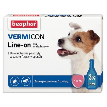 Beaphar Vermicon Line-on krople dla psów o masie ciała poniżej 15kg, w tym szczeniąt powyżej 12. tygodnia życia. Chronią zwierzę przed ektopasożytami, takimi jak pchły, kleszcze, wszy, muchy i komary. Vermicon nie zawiera żadnych chemicznych środków owadobójczych, obezwładnia pasożyty w czysto fizyczny sposób.