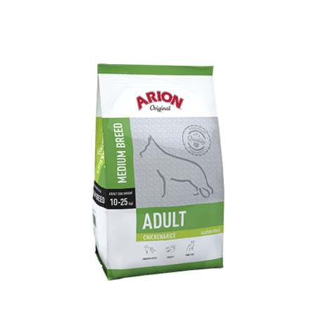 Arion Original Adult Medium Chicken & Rice dedykowana jest dorosłym psom średnich ras o masie ciała od 10 do 25 kg. W pełni zbilansowana, bezglutenowa karma została specjalnie dostosowana do potrzeb żywieniowych psów średnich ras, zapewniając doskonałą jakość żywienia Twojego pupila Głównymi składnikami są kurczak i ryż, bez dodatku kukurydzy, pszenicy czy soi.