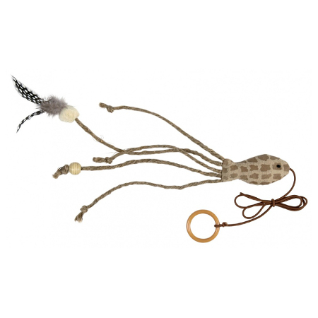 Zabawka rybka na gumce dla kota. Rybka wypełniona kocimiętką, zakończona sznurkami oraz piórkiem, aby zwiększyć zainteresowanie kota zabawką. Plastikowe kółko umożliwia zawieszenie zabawki.