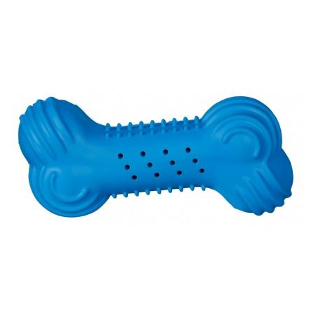 Kość chłodząca z wytrzymałego kauczuku po wypełnieniu wodą i zmrożeniu przyjemnie odświeża jamę ustną psa. Idealna dla szczeniąt w procesie ząbkowania, chłodzi przynosząc ulgę dziąsłom.