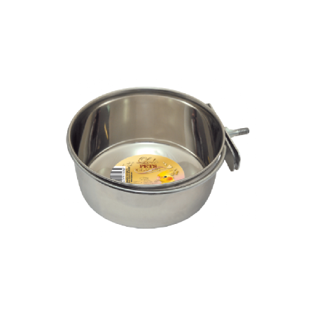 Miska dla ptaków z uchwytem zaciskowym do przymocowania w klatce. Miskę łatwo utrzymać w czystości, dzięki temu, że można ją łatwo wyjąć z obręczy mocującej.