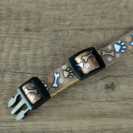 Obroża dla psa z wytrzymałej taśmy nylonowej z motywem łapek i kostek. Idealnie komponuje się ze smyczą z tej samej serii.