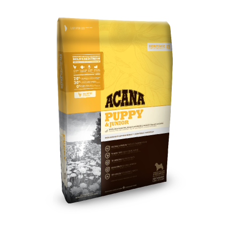 Acana Puppy & Junior dedykowana jest szczeniętom małych i średnich ras osiągających wagę od 9 do 25 kg w wieku dorosłym. To kanadyjska, biologicznie odpowiednia karma pełna świeżych regionalnych składników. Zawiera kurczaka z wolnego wybiegu, jaja ściółkowe, mięso flądry w odżywczych proporcjach WholePrey™ (świeże mięso, organy, chrząstki), które odzwierciedlają naturalną dietę, aby dostarczyć wszystkie odżywcze składniki, których potrzebuje szczenię do prawidłowego rozwoju. Całość uzupełniają dojrzewające w słońcu owoce i warzywa. Dynia i dynia piżmowa wspomagają trawienie, a dodatek liofilizowanej wątróbki wzbogaca smak. Składniki dostarczane codziennie z regionu Alberty są świeże i pełne wartości odżywczych, tak aby Twój szczeniak był zdrowy i silny.