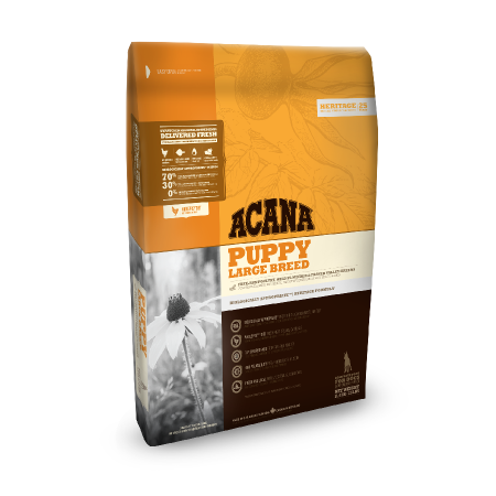 Acana Puppy Large Breed dedykowana jest szczeniętom dużych ras osiągających wagę powyżej 25 kg w wieku dorosłym. To kanadyjska, biologicznie odpowiednia karma pełna świeżych regionalnych składników. Zawiera kurczaka z wolnego wybiegu, jaja ściółkowe, mięso flądry w odżywczych proporcjach WholePrey™ (świeże mięso, organy, chrząstki), które odzwierciedlają naturalną dietę, aby dostarczyć wszystkie odżywcze składniki, których potrzebuje szczenię do prawidłowego rozwoju. Całość uzupełniają dojrzewające w słońcu owoce i warzywa. Dynia i dynia piżmowa wspomagają trawienie, a dodatek liofilizowanej wątróbki wzbogaca smak. Składniki dostarczane codziennie z regionu Alberty są świeże i pełne wartości odżywczych, tak aby Twój szczeniak był zdrowy i silny.