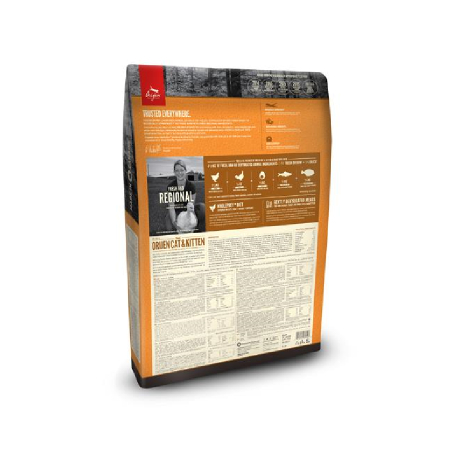 Orijen Cat & Kitten to biologicznie odpowiednia karma pełna świeżych regionalnych składników. Zawiera kurczaka i indyka z chowu bezklatkowego, jaja ściółkowe, flądrę i śledzia pacyficznego w odżywczych proporcjach WholePrey™ (świeże mięso, organy, chrząstki), które odzwierciedlają naturalną dietę, aby dostarczyć wszystkie odżywcze składniki, których potrzebuje kot do prawidłowego rozwoju.
