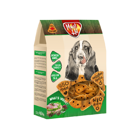 Meat Hit Dental Care z indykiem to wysokiej jakości, kanadyjskie przysmaki dla wszystkich psów w każdym wieku. Zastosowanie techniki wypiekania Oven Baked pozwala zachować wyjątkowe walory smakowe i wartości odżywcze. Zawierają 50% mięsa - świeże mięso indyka, dehydratyzowane mięso kurczaka i świeże ryby. Warzywa, zioła i pozostałe składniki są doskonałym uzupełnieniem zdrowej i odżywczej diety.