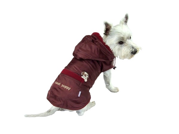 Bardzo wygodne ubranko z kapturem, łatwo i szybko zakłada się na pieska. Wykonane z nieprzemakalnego ortalionu, doskonale chroni przed zimnem, wiatrem i deszczem. Na plecach widnieje ozdobna kieszonka z aplikacją. Płaszczyk od spodu podszyty mięciutkim polarem, zapinany pod brzuszkiem i pod szyją na regulowane rzepy.