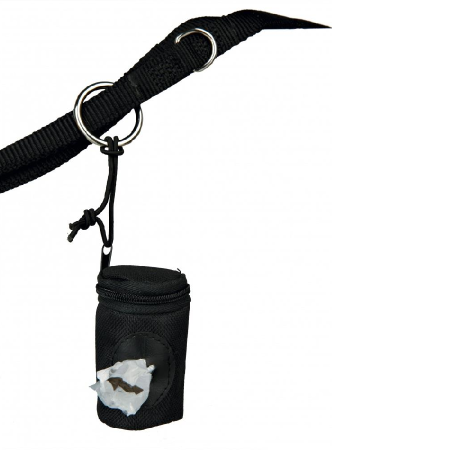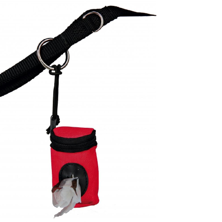 Pojemnik do woreczków na odchody z dwiema rolkami woreczków w zestawie. Miękki, materiałowy pojemnik, zamykany na suwak od góry, z bocznym otworem do wygodnego wyciągania woreczków. Zamocowany na elastycznej lince umożliwiającej przyczepienie do smyczy, plecaka itp.