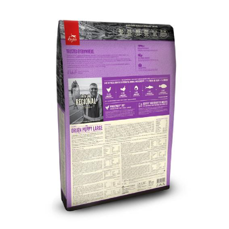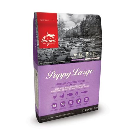 Orijen Puppy Large to kanadyjska karma opracowana z myślą o szczeniętach dużych ras i ich intensywnym rozwoju. Wszystkie psy potrzebują diety bogatej w świeże składniki, dlatego formuła karmy została skomponowana tak, aby odpowiadać naturalnej diecie psów. Nowa formuła zawiera więcej mięsa niż kiedykolwiek, aż 85%, a 15% stanowią owoce i warzywa pochodzące z lokalnych upraw.
