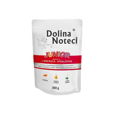 Dolina Noteci Premium Junior to pełnoporcjowa karma dla szczeniąt oraz młodych psów średnich i dużych ras bogata w serca wołowe.