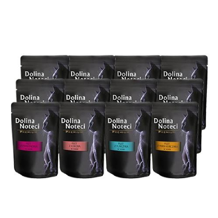 Dolina Noteci Premium to pełnoporcjowa karma dla dorosłych kotów wszystkich ras. Dostępna w korzystnym pakiecie 12x85g, zawierającym 4 smaki.